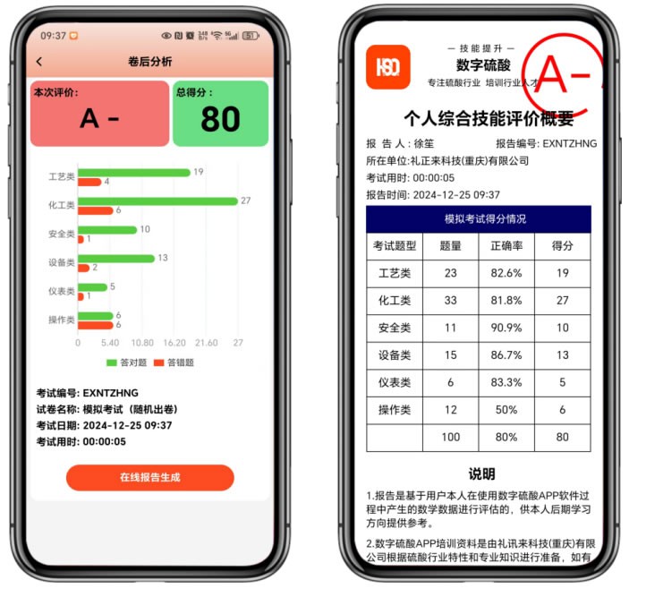 在模擬考試過程中,我們采用系統(tǒng)隨機(jī)抽取試卷的方式,將測試題目類型劃分為單選題、多選題、判斷題和填空題??忌柙谝?guī)定的時(shí)間內(nèi)完成所有題目,并提交試卷以計(jì)算總分。點(diǎn)擊“在線報(bào)告生成”按鈕后,即可生成“個(gè)人綜合技能成績表”。