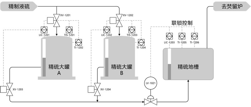 精硫作為裝置生產(chǎn)的原料,為確保原料供應(yīng)的穩(wěn)定性和精硫罐的可靠性,通常會設(shè)計(jì)兩個精硫大罐用于儲存精制液硫。精硫大罐的容量根據(jù)裝置規(guī)模和儲存時間確定,基本的儲存時間應(yīng)滿足15至30天的用量需求。根據(jù)精硫的儲存時間差,大罐還可以通過物理沉降的方式,使液硫中的雜質(zhì)進(jìn)一步沉淀至罐底,從而減少系統(tǒng)中的灰分含量。因此,實(shí)現(xiàn)精硫大罐的自動倒罐和罐、槽液位的自動控制顯得尤為重要。為此,我們專門設(shè)計(jì)了精硫大罐自動控制方案。