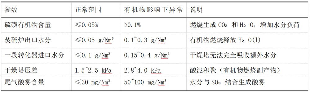 表1為有機(jī)物對(duì)參數(shù)影響對(duì)照表,實(shí)際生產(chǎn)中需控制硫磺中水分含量及酸度,水分過高會(huì)促進(jìn)SO3轉(zhuǎn)化為酸霧,而酸度超標(biāo)將加速設(shè)備腐蝕。