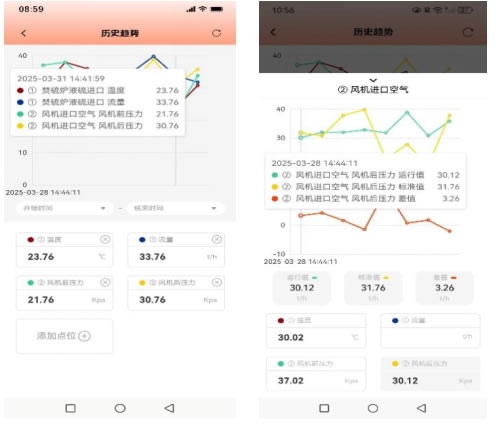 在歷史趨勢(shì)功能中,您可以選擇裝置運(yùn)行的起始和結(jié)束時(shí)間,并指定需要查看的多個(gè)點(diǎn)位。隨后,系統(tǒng)將展示這些點(diǎn)位在不同時(shí)間節(jié)點(diǎn)的數(shù)據(jù)走勢(shì)(前提是您在模擬診斷中已保存多套數(shù)據(jù),歷史趨勢(shì)中才會(huì)顯示相應(yīng)的曲線和數(shù)據(jù))。此外,若您希望深入了解某個(gè)點(diǎn)位的數(shù)據(jù)詳情,只需點(diǎn)擊下半?yún)^(qū)對(duì)應(yīng)數(shù)據(jù)的單元格即可。