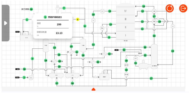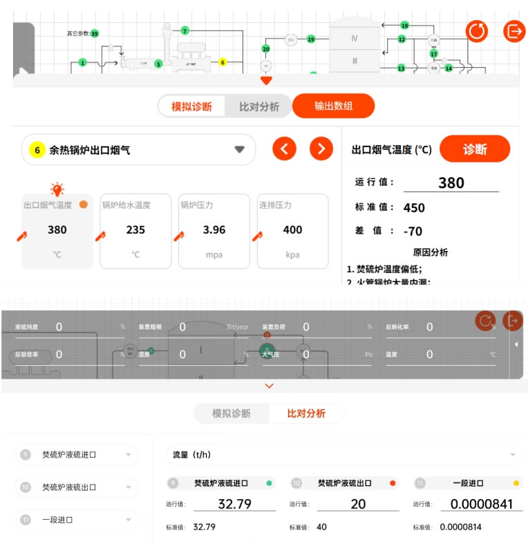 在模擬診斷功能中,我們提供了一套硫-物料平衡圖作為默認(rèn)的裝置圖。模擬診斷界面中展示的數(shù)據(jù)均基于您在裝置信息中填寫(xiě)的數(shù)據(jù)計(jì)算得出。當(dāng)然,您也可以通過(guò)點(diǎn)擊底部的“工作臺(tái)”或左側(cè)的裝置信息面板,修改運(yùn)行值來(lái)干預(yù)計(jì)算得出的標(biāo)準(zhǔn)值。此外,我們?yōu)椴糠贮c(diǎn)位提供了“診斷功能”。當(dāng)某些點(diǎn)位的診斷按鈕呈現(xiàn)“橙色”高亮?xí)r,表示該點(diǎn)位可執(zhí)行診斷操作。系統(tǒng)將根據(jù)您輸入的運(yùn)行值與計(jì)算得出的標(biāo)準(zhǔn)值進(jìn)行差值比對(duì),并根據(jù)差值情況調(diào)整點(diǎn)位顏色,同時(shí)輸出相應(yīng)的偏低或偏高的分析語(yǔ)句,幫助您迅速定位導(dǎo)致差值產(chǎn)生的原因。