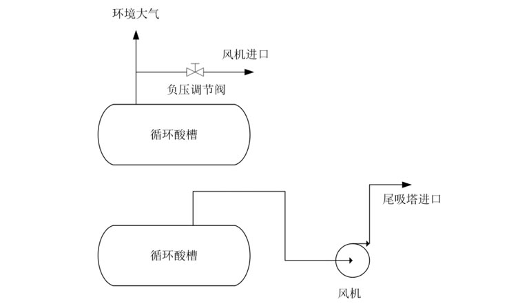 1.當(dāng)前硫酸裝置為了回收干燥循環(huán)槽和二吸塔循環(huán)槽產(chǎn)生的酸性氣體,采用管道將循環(huán)槽與主風(fēng)機(jī)進(jìn)口連接,利用主風(fēng)機(jī)入口的負(fù)壓進(jìn)行回收,使氣體重新進(jìn)入制酸系統(tǒng)以生產(chǎn)硫酸。然而,由于干燥塔和二吸塔的循環(huán)酸泵槽內(nèi)部襯有耐酸磚,無(wú)法承受震動(dòng)載荷,因此,泵不能直接安裝在泵槽本體上,需要單獨(dú)設(shè)立泵架。由于泵架與泵槽之間存在間隙且無(wú)法消除,經(jīng)過(guò)一段時(shí)間的使用后,發(fā)現(xiàn)連接管道因干燥泵座和二吸泵座無(wú)法實(shí)現(xiàn)完全密封,含水空氣通過(guò)間隙進(jìn)入泵槽內(nèi)部,與酸性液體混合形成稀酸。稀酸腐蝕管道后形成的酸泥會(huì)堵塞通路,導(dǎo)致酸性氣體無(wú)法被抽到主風(fēng)機(jī)進(jìn)口。最終,酸性氣體直接排放到大氣中,嚴(yán)重污染環(huán)境。為解決這一問(wèn)題,一些硫酸裝置對(duì)原廢氣回收工藝進(jìn)行了改進(jìn),采用風(fēng)機(jī)進(jìn)行抽吸。