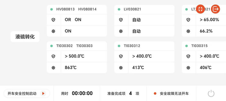 硫酸裝置的開車流程復(fù)雜且環(huán)環(huán)相扣,任何疏漏都可能帶來安全風(fēng)險。本功能旨在推動開車過程的流程化、規(guī)范化,不僅為熟練操作人員提供標(biāo)準(zhǔn)化指引,更為企業(yè)實現(xiàn)經(jīng)驗沉淀與新人培訓(xùn)提供有力支撐。每一家化工廠的操作習(xí)慣與管理要求各不相同,我們致力于讓每一次安全操作成為企業(yè)獨一無二的數(shù)字資產(chǎn),助力企業(yè)構(gòu)建可持續(xù)傳承的“數(shù)字永生”。 點擊左下角“開車安全控制啟動”,您可按照液硫轉(zhuǎn)化、干燥吸收、余熱回收與鍋爐風(fēng)機的順序逐步填寫真實運行數(shù)據(jù)。只有當(dāng)所有工段均滿足預(yù)設(shè)開車條件后,系統(tǒng)才允許執(zhí)行最終的裝置開車操作。
