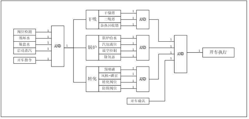 只有在這些環(huán)節(jié)都得到妥善處理后,才能開啟風機并開始噴硫磺。在啟動過程中,裝置的工藝流程從靜態(tài)狀態(tài)轉變?yōu)閯討B(tài),工藝參數可能會發(fā)生劇烈波動。若裝置準備不足,極易引發(fā)事故。因此,對啟動過程進行嚴格的安全控制至關重要?;趩舆^程中可能出現的變化,設計一套完善且合理的控制邏輯顯得尤為關鍵。關于開車安全自動控制邏輯的詳細信息,請參見圖1。