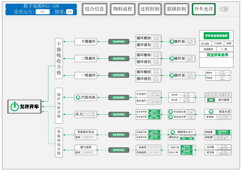 裝置在開車過程中往往是最忙碌的,經過檢修或者緊急處理后,操作人員需要對裝置的當前狀態(tài)進行多項人工確認,由于時間緊迫和高強度的操作會使操作人員在開車過程中身心疲憊,難以集中,開車過程中的事故通常是在這種情況下發(fā)生的。美國ASM(異常狀態(tài)管理協會)研究,化工裝置引起異常狀態(tài)的原因有36%是設備故障引起,有22%是工藝引起,有42%是操作人員失誤引起。因此一套人機友好的開車安全自動控制系統(tǒng)就顯得尤為重要,能指導操作人員自動完成開車安全的自動檢查,出現故障能協助操作人員完成故障排除,在開車前使裝置各關鍵條件100%滿足要求,有效防止人員失誤引起的開車事故發(fā)生,圖2、圖3為DSC-100硫酸裝置開車安全自動控制系統(tǒng)在80萬噸硫磺制酸裝置上的控制畫面。