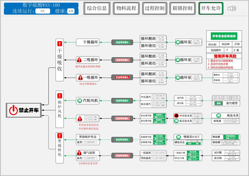 在啟動硫磺制酸裝置的過程中,由于工藝參數未達標、閥門設置不當或檢查不充分,經常會發(fā)生生產、安全和環(huán)保方面的事故。這些事故包括“升華硫、水擊蒸汽爆管、煙熏、稀酸腐蝕”等嚴重問題,給企業(yè)帶來巨大的經濟損失和負面社會影響。隨著硫酸裝置自動化水平的提高和長期穩(wěn)定運行,生產操作人員對裝置的操作技能和應急響應能力有所減弱,同時對裝置運行數據和信息閾值的掌握也顯著降低。這導致了在開車過程中對硫酸裝置安全控制的減弱。據2024年的統(tǒng)計數據,多套高度自動化的硫磺制酸裝置在開車過程中因工藝參數不達標、閥位設置不當而發(fā)生了安全事故。在硫磺制酸裝置自動化普及和操作人員減少的背景下,開發(fā)一套開車安全自動控制系統(tǒng)成為預防開車事故的關鍵。禮正來科技一直專注于硫酸裝置的數字化研究與開發(fā),致力于解決行業(yè)難題。為了滿足行業(yè)需求,我們研發(fā)了DSC-100硫酸裝置開車安全自動控制系統(tǒng)。該系統(tǒng)根據硫酸裝置各工段的特性以及開車所需滿足的條件進行設計,具備以下功能:開車準備階段的順序操作、開車前關鍵工藝參數的自動確認、開車前各閥位的安全位置自動確認、開車前所需條件的滿足情況確認以及開車過程的安全控制等。