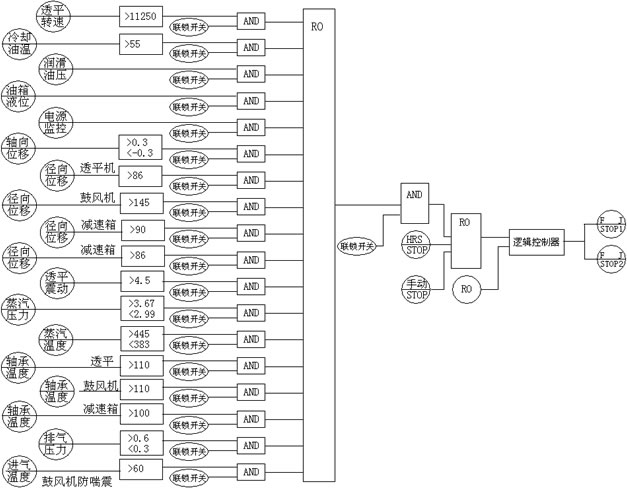 在硫磺制酸裝置中透平屬于單級(jí)透平,由硫磺制酸裝置余熱鍋爐產(chǎn)生的中壓過熱蒸汽驅(qū)動(dòng),拖動(dòng)軸流風(fēng)機(jī)。采用505控制器控制透平轉(zhuǎn)速,有DCS連鎖保護(hù)。用DCS系統(tǒng)測(cè)量透平液位、溫度、壓力、震動(dòng)、位移、轉(zhuǎn)速測(cè)量點(diǎn),并實(shí)施連鎖保護(hù)運(yùn)算(見圖3)。