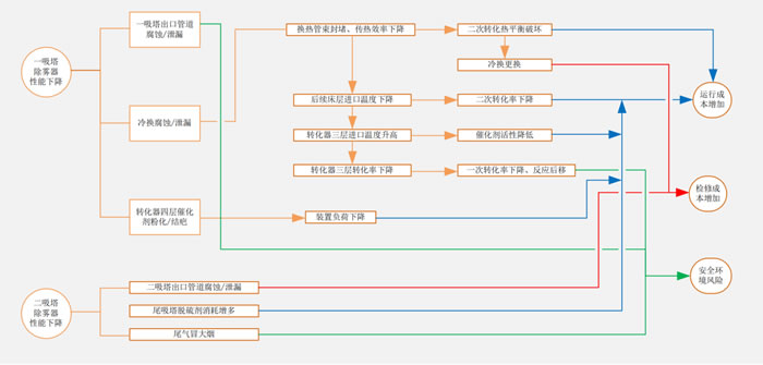 二吸塔除霧器帶酸造成下游管道、設(shè)備腐蝕和泄漏,上述泄漏需要停車處理,相應(yīng)地硫酸裝置開車率也會下降?!?】